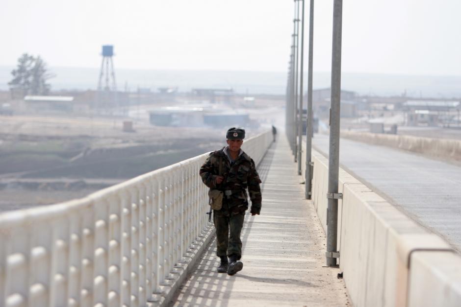 A Tajik border guard walks on a bridge over the river Piandj on the Tajik-Afghan border, 29 February 2008.