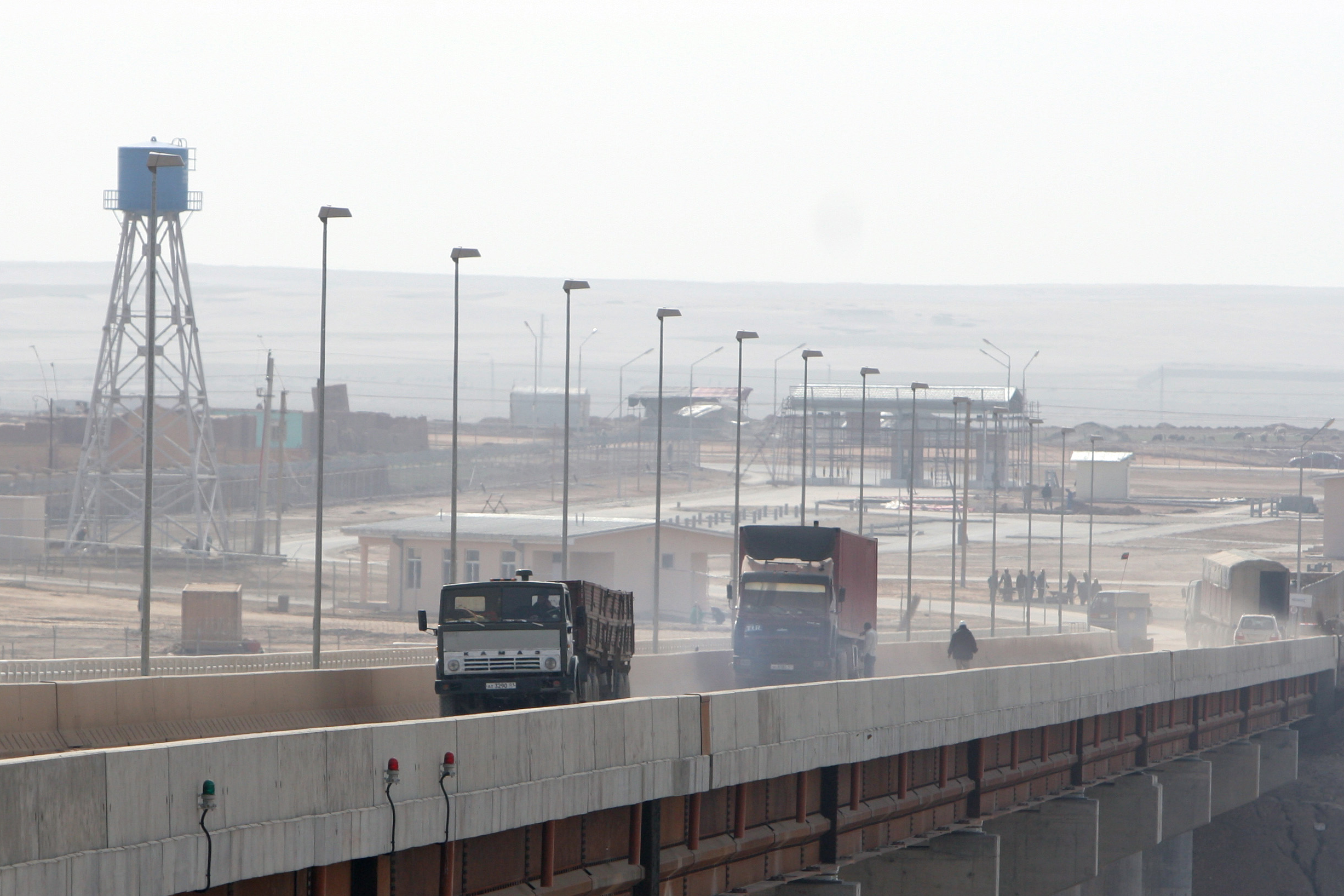 Trucks drive on a bridge over the river Piandj on the Tajik-Afghan border, 29 February 2008.