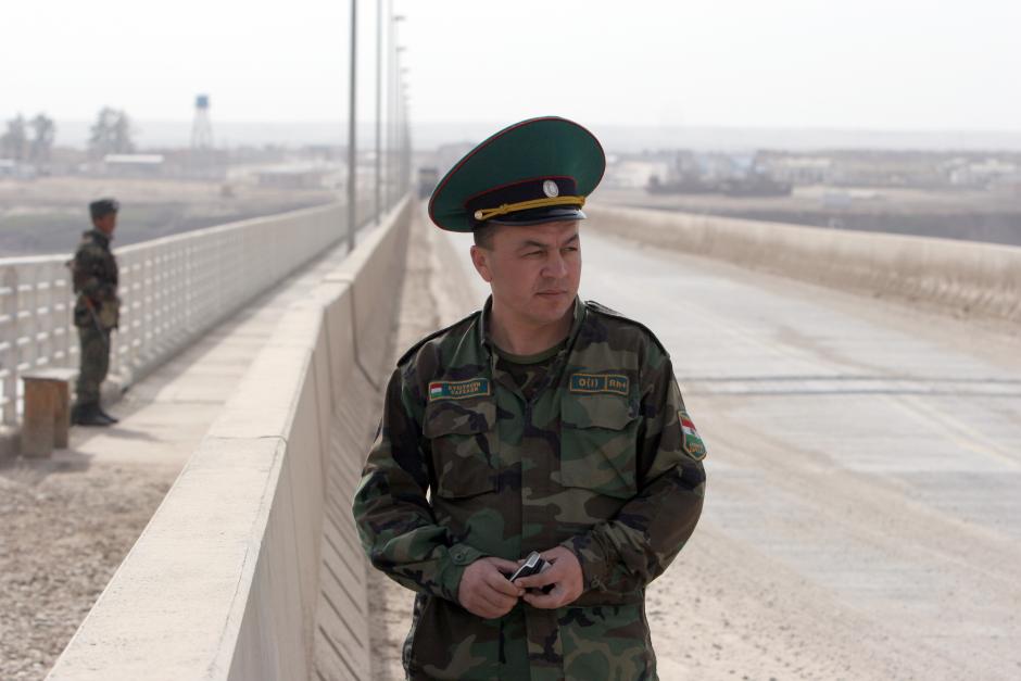 Tajik border guards keep watch on a bridge over the river Piandj on the Tajik-Afghan border, 29 February 2008.