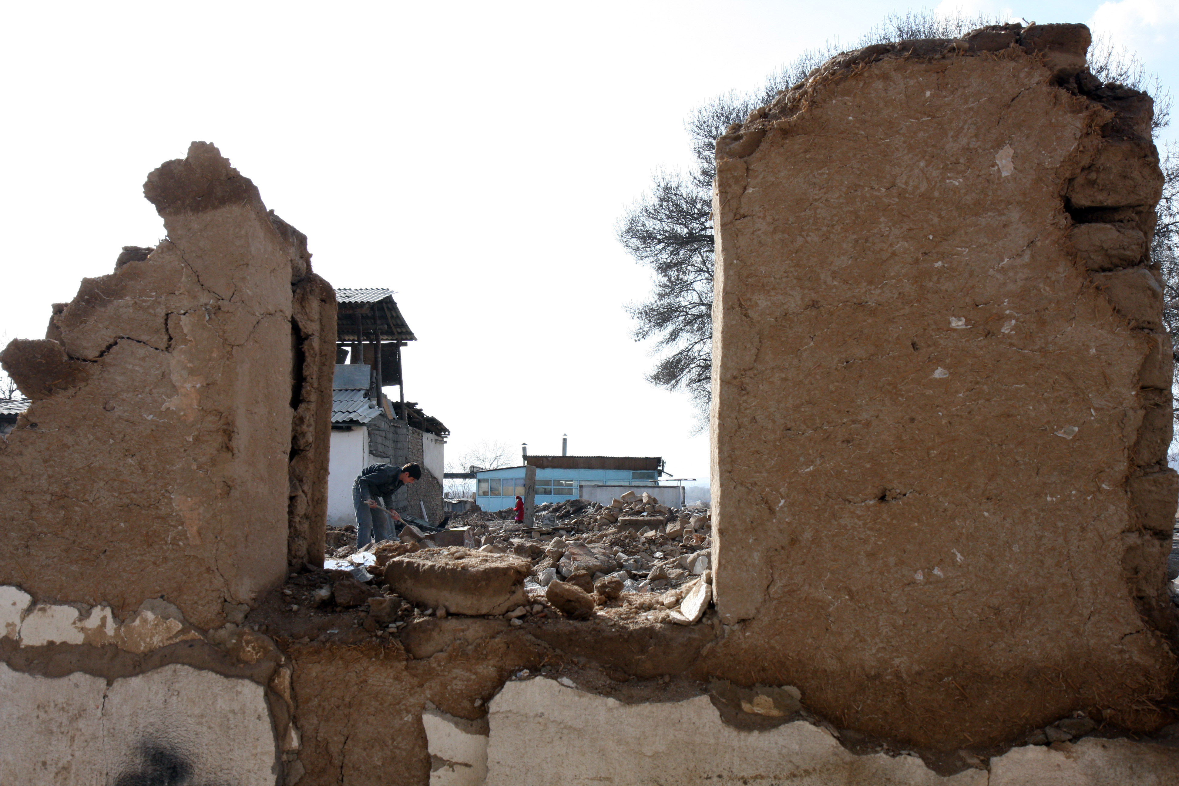 People search through the rubble of a demolished house in Dushanbe, 1 March 2008.
