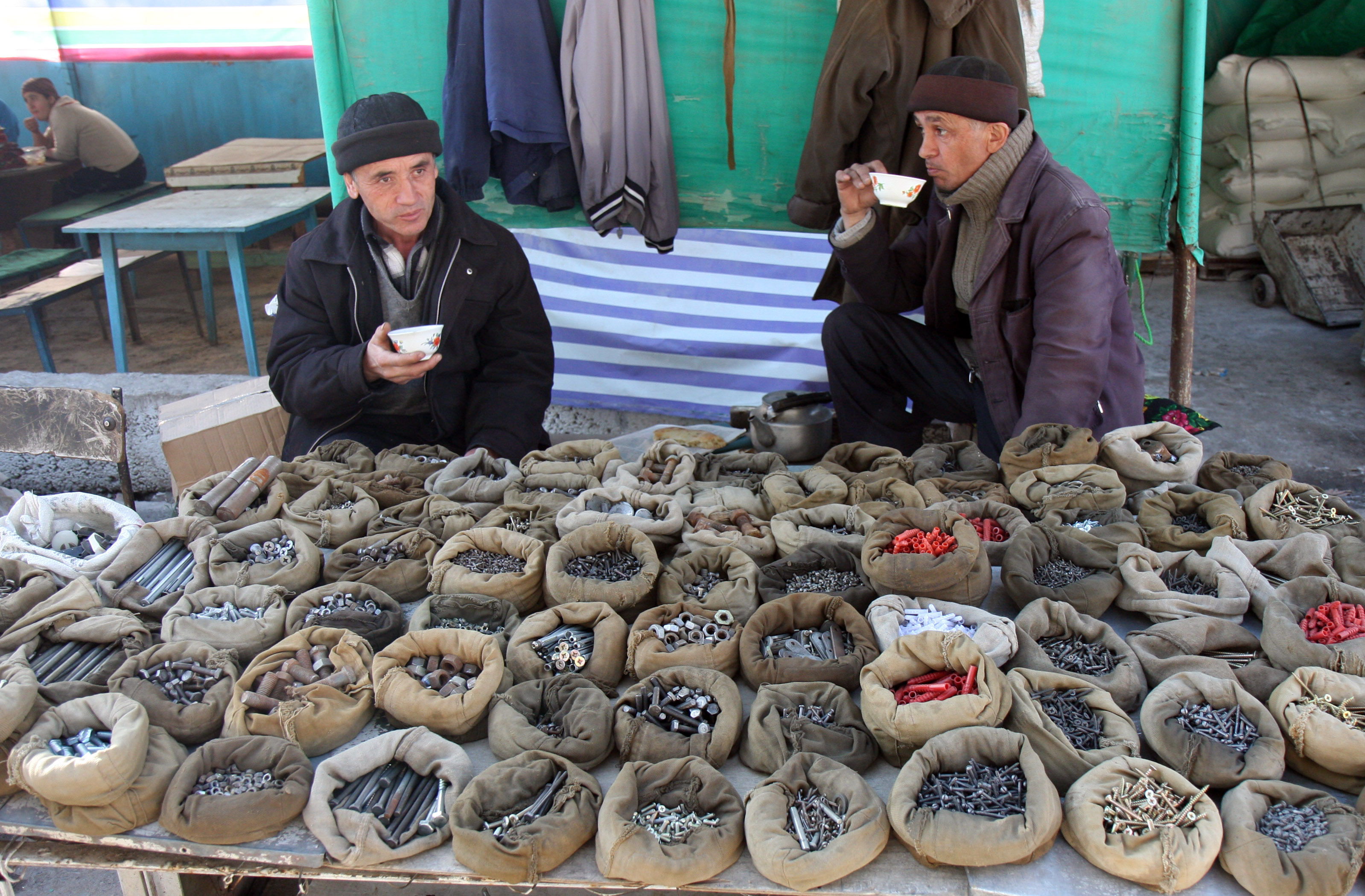 Vendors selling nails at the central market in the Tajik capital Dushanbe, 26 February 2008.