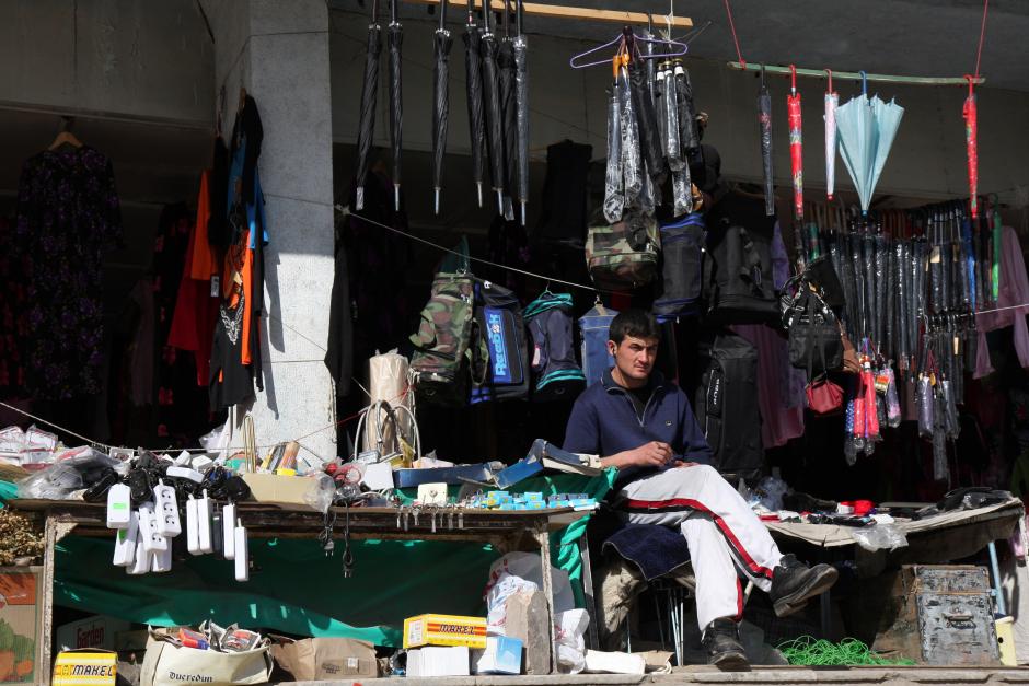 A vendor selling commercial goods awaits customers at the central market in Dushanbe, 26 February 2008.