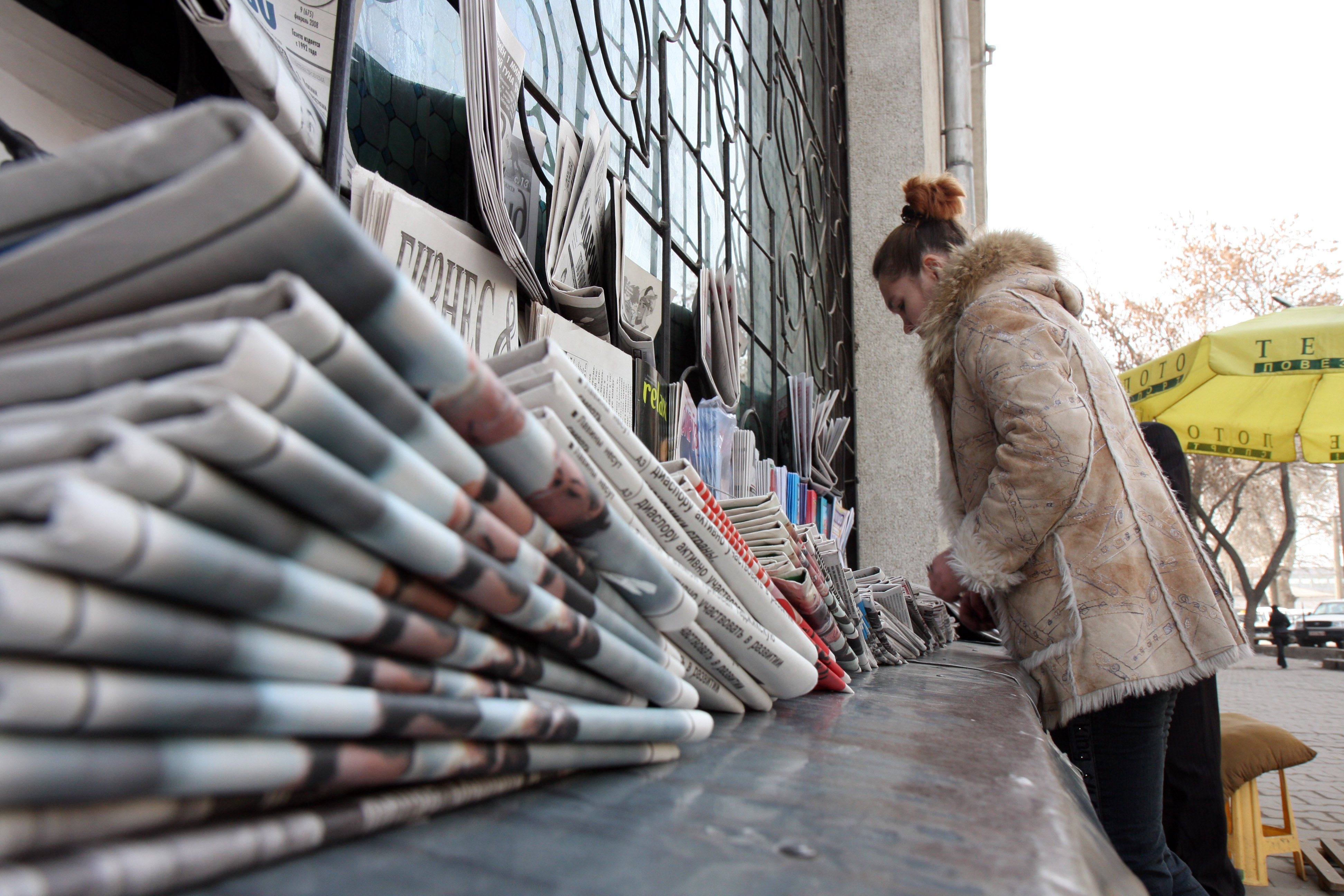 Newspapers on sale in the street in the Tajik capital Dushanbe, 28 February 2008.