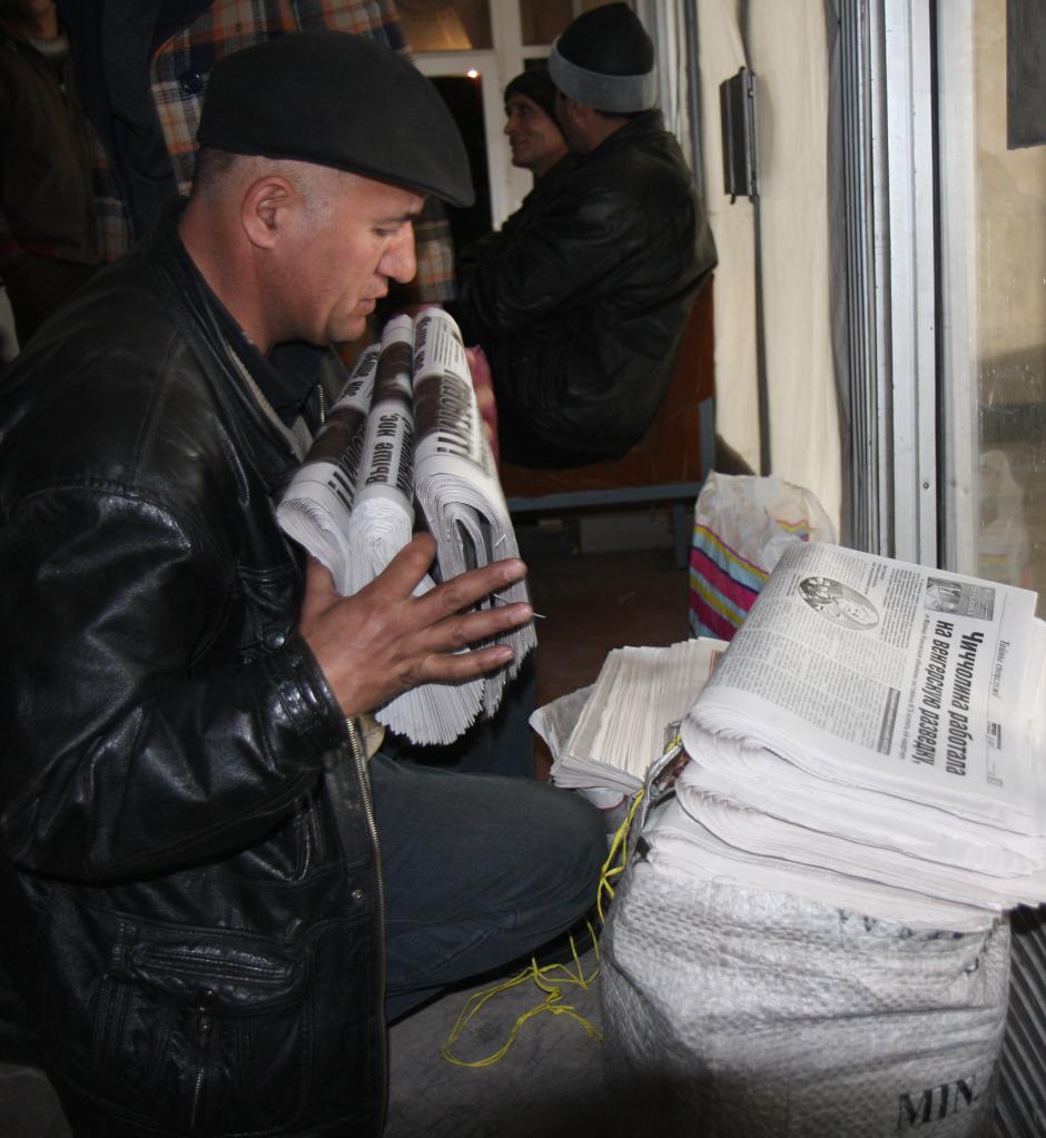 A newspaper distributor picks up the latest editions of Tajikistan press in Dushanbe, 28 February 2008.