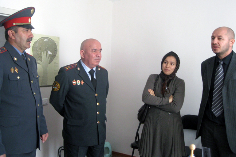 L-r: Col. Abduvahob Iskandarov, Head of Kulyab City Police Department; Col. Zikriyo Rasullov, Deputy Head of Khatlon Regional Police in Kulyab Zone; OSCE Field Office Assistant Mavjuda Gaffurova, and Sandro Bošnjak, the Head of the Department for EU Integration, Implementation and Monitoring of Projects at the Croatian Interior Ministry, during a visit to share expertise and experience on police reform and the response to domestic violence, 30 November 2011.