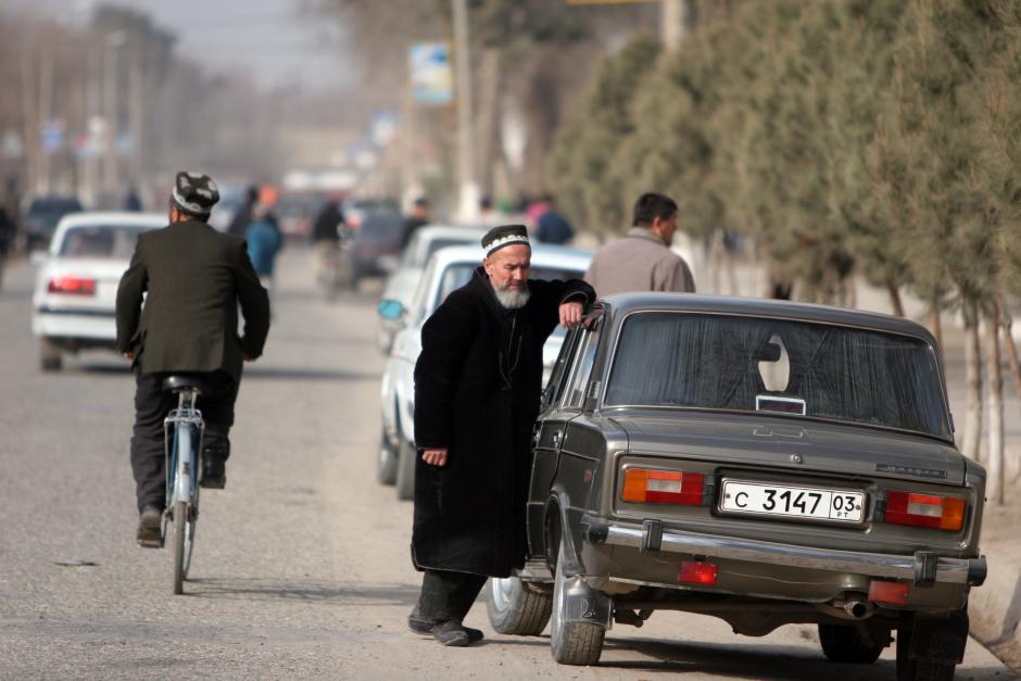 A Tajik man leans on his Russian-made Lada near Kurgan Tube, 29 February 2008.