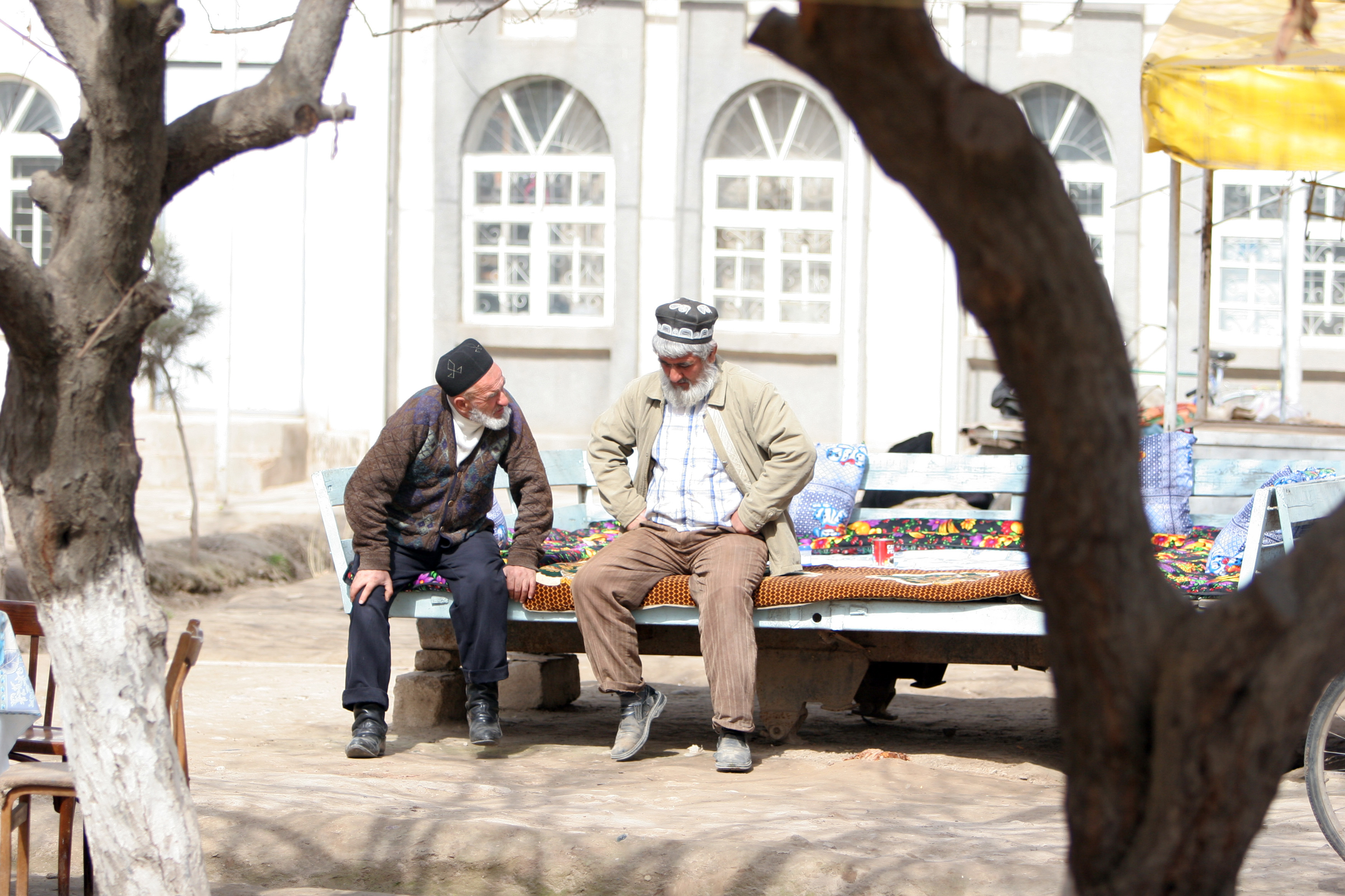 Elderly men chat at a market south of the Tajik city of Kurgan Tube, 29 February 2008.