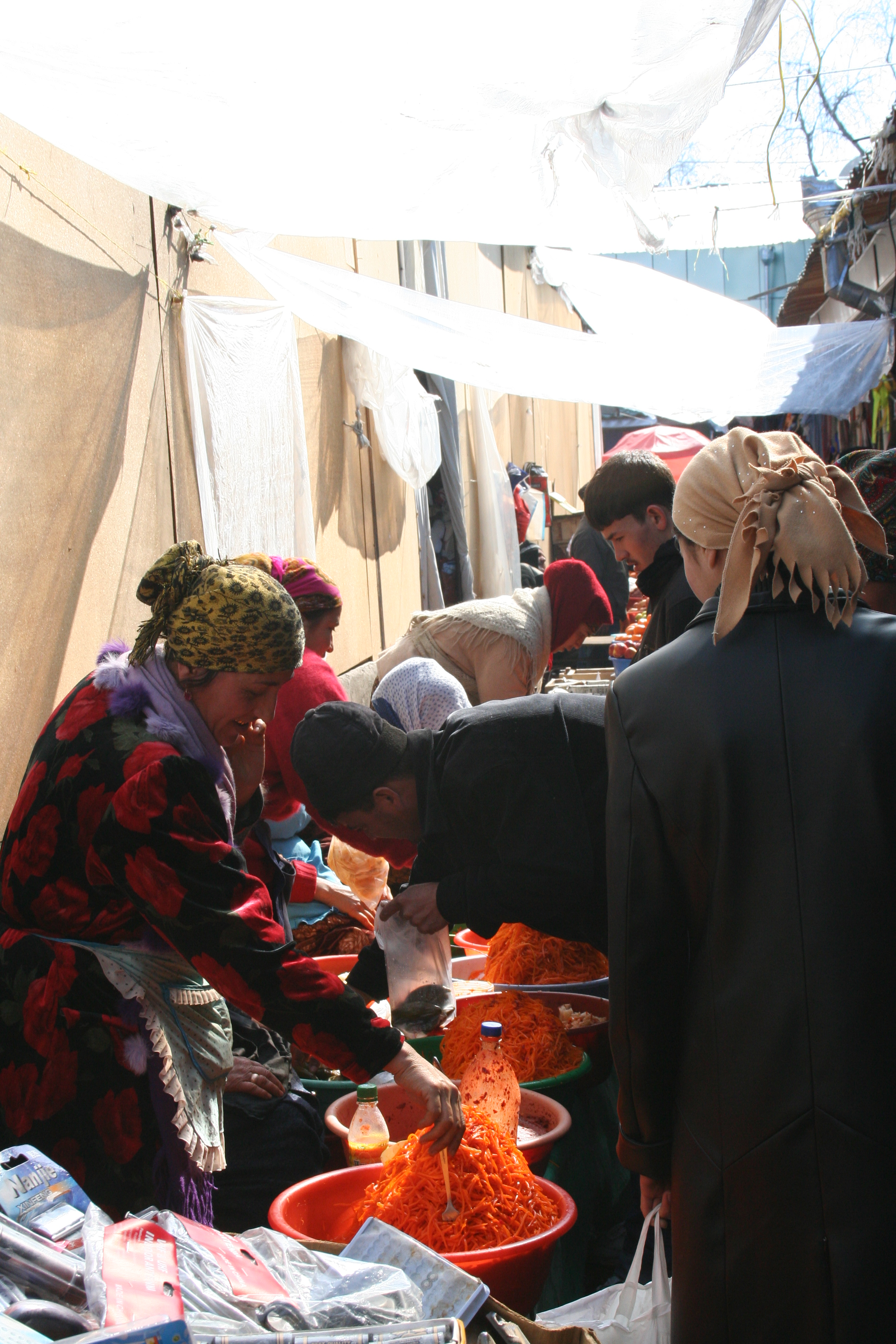 Vendors sell traditional pickles in a market in Dushanbe, February 2008.