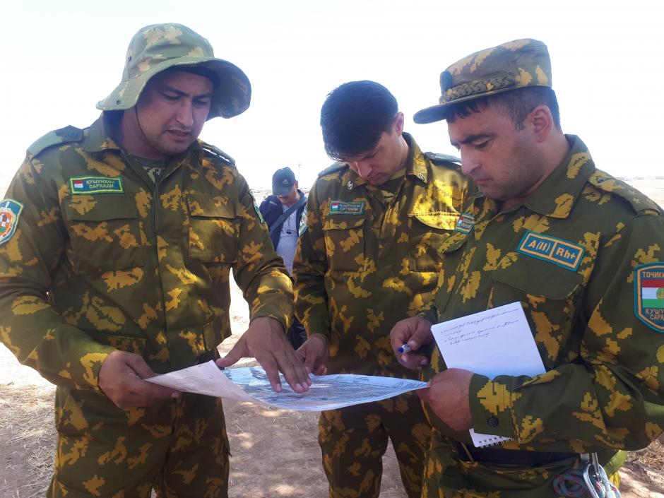 Сарҳадбонони тоҷик дар ҷараёни курси чорҳафтаинаи омӯзишӣ оид ба таҳкими иқтидори устувори амалиётӣ дар маҳалҳо, Ҳисор, Тоҷикистон, 3 сентябри соли 2019.