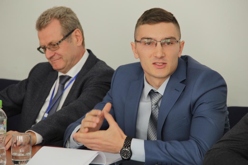 Иштван Саму (аз тарафи чап), коршиноси полиси Маҷористон ва Артем Митко (аз тарафи рост), омӯзгор аз Гурӯҳи машваратии сарҳадии Русия, Душанбе, 25 октябри соли 2019.