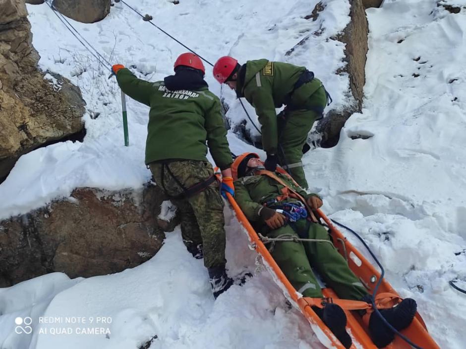 Наҷотбахшони Кумитаи ҳолатҳои фавқулодда ва мудофиаи граждании Тоҷикистон ҳангоми машғулиятҳои амалӣ дар ноҳияи Варзоб, 25 январи соли 2021.