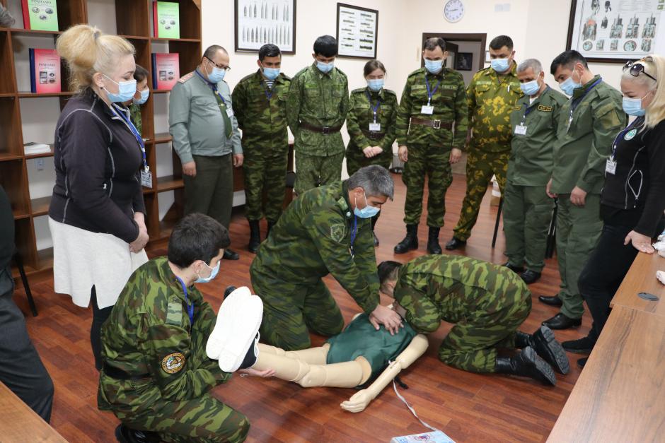 Иштирокчиён ҳангоми амалисозии расонидани ёрии аввалия ва интиқоли шахсони маҷрӯҳ ҳангоми нобудсозии муҳимоти тарканда, Чимтеппа, 30 марти соли 2021.