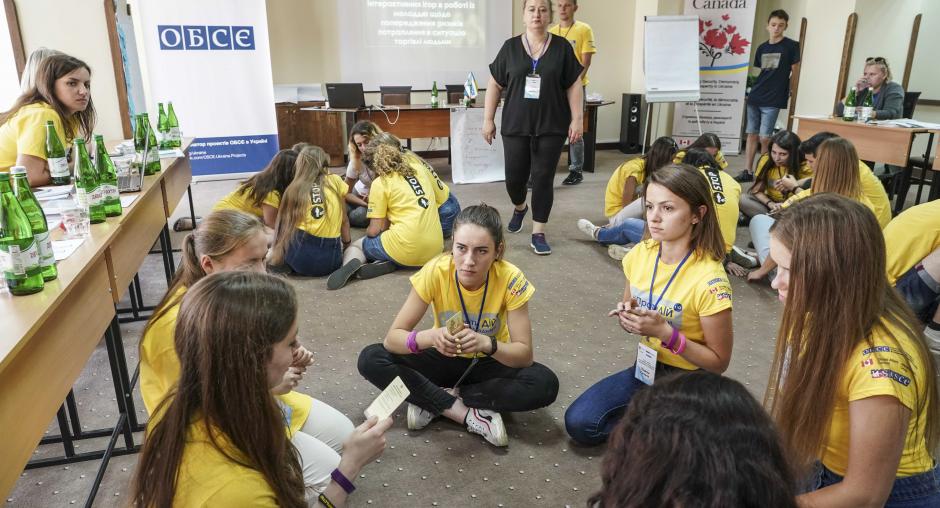 Студенти - майбутні соціальні працівники та психологи вдосокналюють навички з ідентифікації та допомоги постраждалим від торгівлі людьми у практичній вправі під час Літньої Школи, організованої Координатором проектів ОБСЄ. Яремче, 17 червня 2019 р. (ОБСЄ/Євген Малолетка)