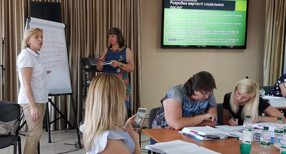 Оксана Івасів (зліва), тренер з неурядової організації «ТЦК» пояснює методологію розрахунку вартості соціальної послуги представникам організацій громадянського суспільства та місцевих органів влади на тренінгк, організованому ОБСЄ в Києві, 29 травня 2018 р. (ОБСЄ)