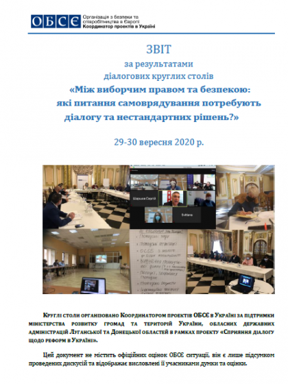 В 2020 році в рамках проекту « Сприяння діалогу щодо реформ в Україні » Координатор проектів ОБСЄ в Україні за підтримки Міністерства розвитку громад та територій України провів діалогові круглі столи « Між виборчим правом та безпекою: які питання самоврядування потребують діалогу та нестандартних рішень? » в Донецькій та Луганській областях, створюючи майданчик для діалогу між зацікавленими сторонами в рамках реформи децентралізації. Зокрема, ці заходи фокусувалися на обговоренні непризначення перших місцевих виборів у окремих громадах Донецької та Луганської областей восени 2020 року з причин безпеки. Цей звіт містить аналіз передумов проведення діалогових заходів, опис викликів в обох областях щодо виборів та питань безпеки, а також результати обговорень та пропозиції для окремих стейкголдерів процесу призначення виборів. Крім того, звіт розкриває особливості методології організації а проведення заходів у форматі діалогу.
