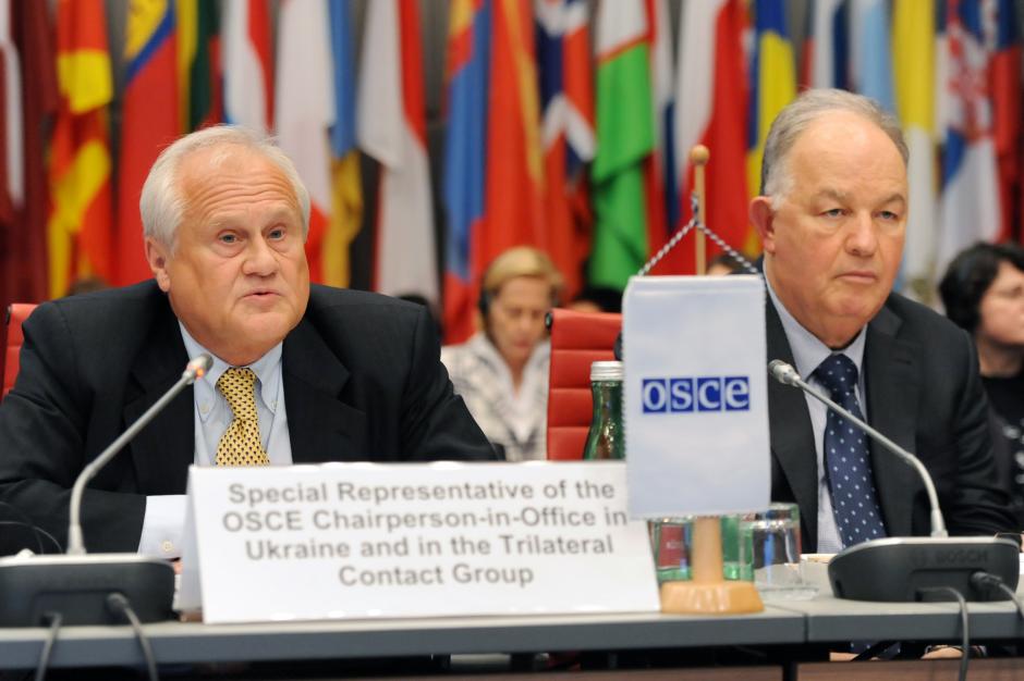 (зліва направо) Посол Мартін Сайдік, Спеціальний представник Чинного голови ОБСЄ в Україні та у Тристоронній контактній групі, та Посол Ертурул Апакан, Голова Спеціальної моніторингової місії ОБСЄ в Україні, на засіданні в рамках Форуму ОБСЄ з питань співробітництва в безпековій сфері, м. Відень, 4 жовтня 2016 р.