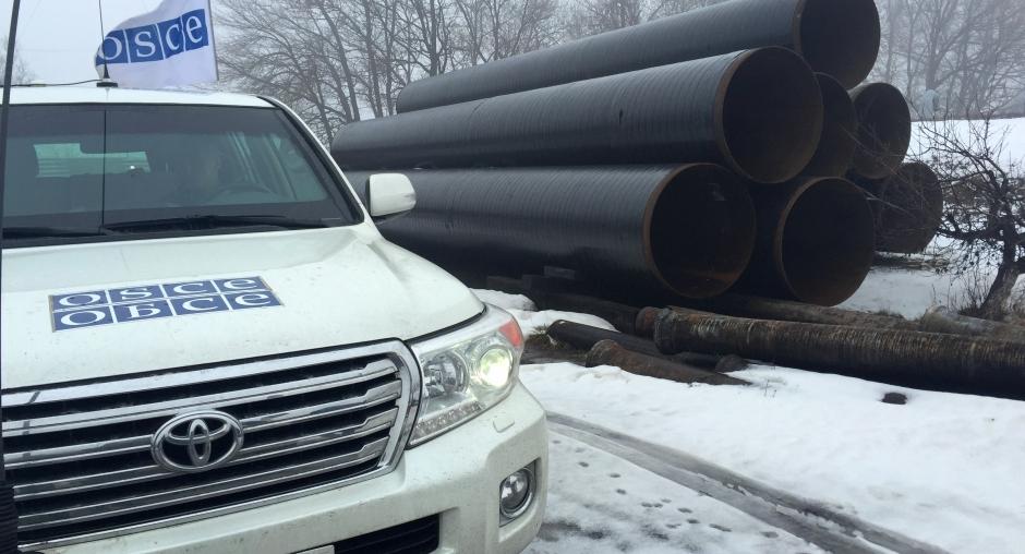Дзеркальний патруль Спеціальної моніторингової місії ОБСЄ під час проведення ремонтних робіт на ділянці пошкодженого водогону «Карбоніт–Первомайськ». Це одна із 12 ділянок, що були визначені Тристоронньою контактною групою в Мінську як пріоритетні для розмінування та відновлення (ОБСЄ/Марія Паола Паннаккьюллі)