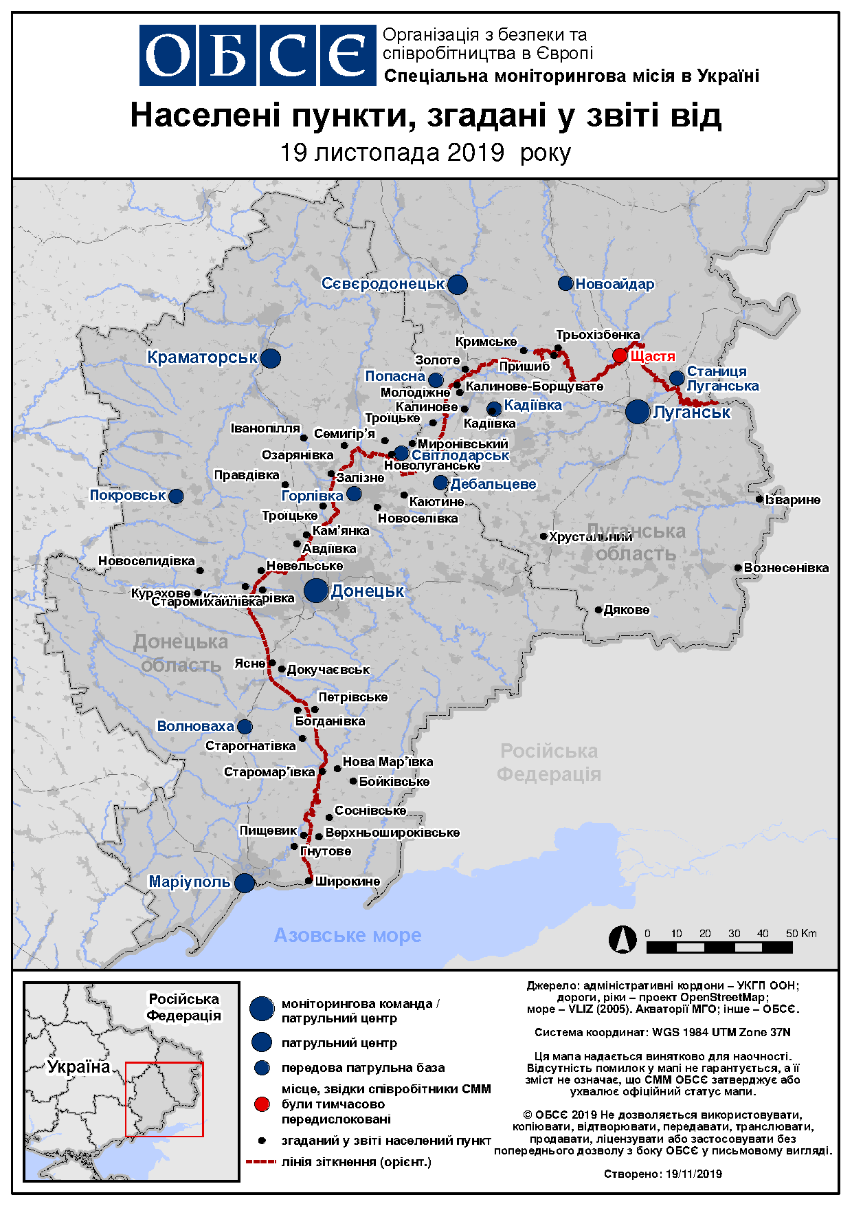На основі інформації, що надійшла від моніторингових команд станом на 19:30 18 листопада 2019 року (за східноєвропейським часом)