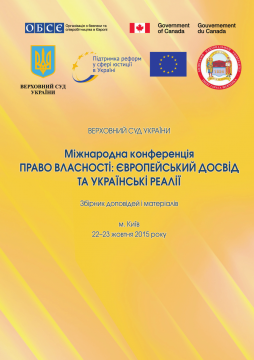 У цій публікації зібрані доповіді та матеріали Міжнародної конференції «Право власності: європейський досвід та українські реалії», що була проведена у м. Київ 22–23 жовтня 2015 року. Захід був організований Координатором проектів ОБСЄ в Україні, спільно з Верховним Судом України, проектом ЄС «Підтримка реформ у сфері юстиції в Україні» та юридичним факультетом Київського національного університету імені Тараса Шевченка у рамках Проекту ОБСЄ «Гарантування дотримання прав людини при здійсненні правосуддя», що впроваджується за фінансової підтримки уряду Канади.