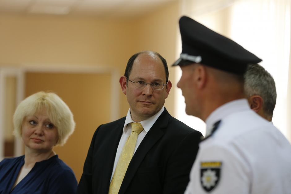 Руденко та Ерліх в коридорах Харківського національного університету внутрішніх справ спілкуються з його ректором Валерієм Сокуренко.