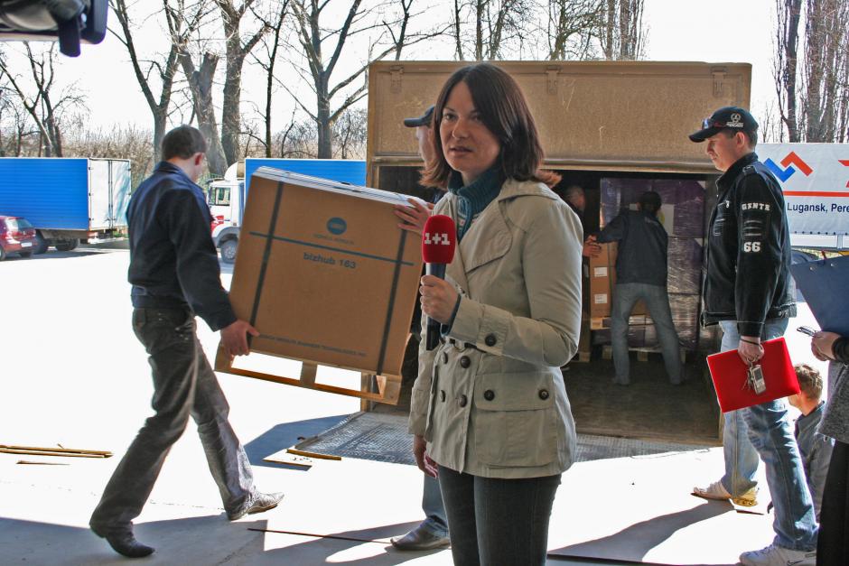 Репортаж журналістки каналу 1+1 про передачу Координатором проектів ОБСЄ в Україні комп’ютерного обладнання для створення Державного реєстру виборців Центральній виборчій комісії, квітень 2009р.