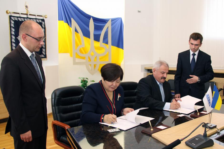 Координатор проектів ОБСЄ в Україні, посол Мадіна Джарбусинова (ц-л) та заступник Міністра внутрішніх справ України, Сергій Лекарь (ц-п), підписують договір про передачу комп'ютерного обладнання під час церемонії в Києві, 25 жовтня 2012 р.