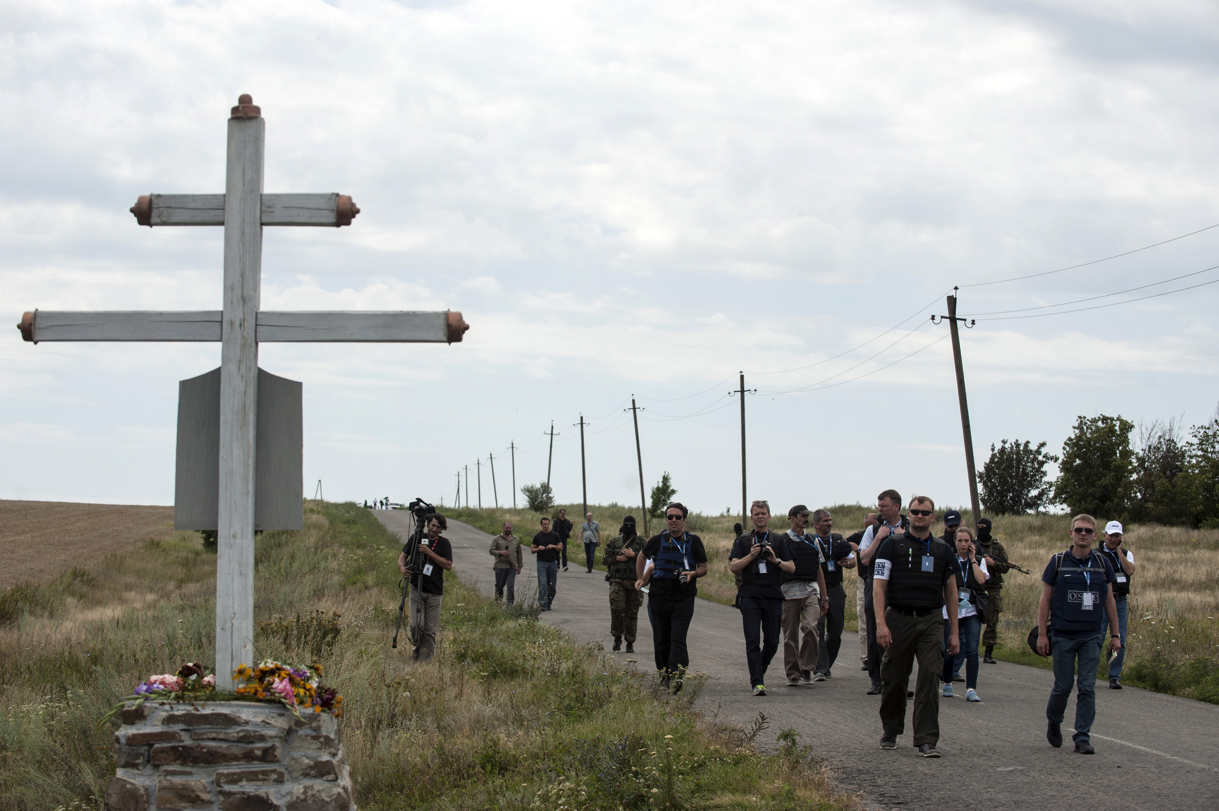 Members of the OSCE Special Monitoring Mission to Ukraine are forced to walk to the crash site by people who are controlling the area.