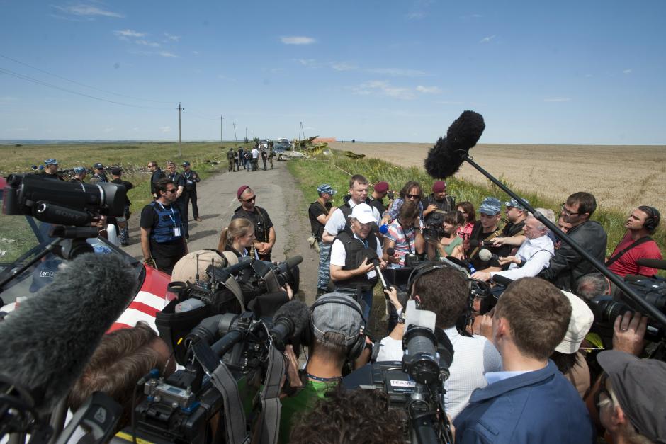 Michael Bociurkiw, Spokesperson of the OSCE Special Monitoring Mission to Ukraine, gives a press briefing at the MH17 crash site.