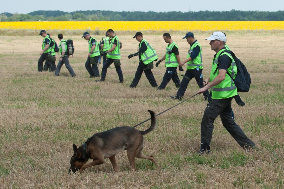 International investigators use sniffer dogs at the MH17 crash site, 5 August 2014.