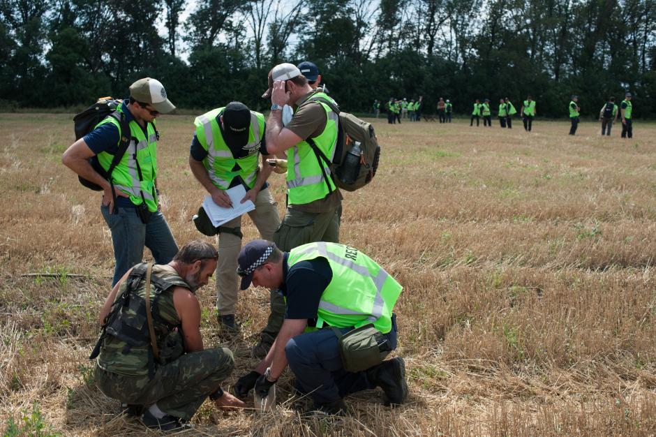 International investigators and an armed man examine an object at the MH17 crash site, 5 August 2014.