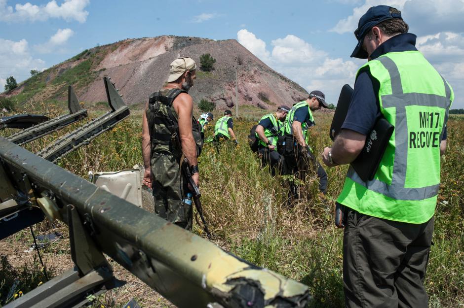 Armed man watches over international investigators as they work, 5 August 2014.