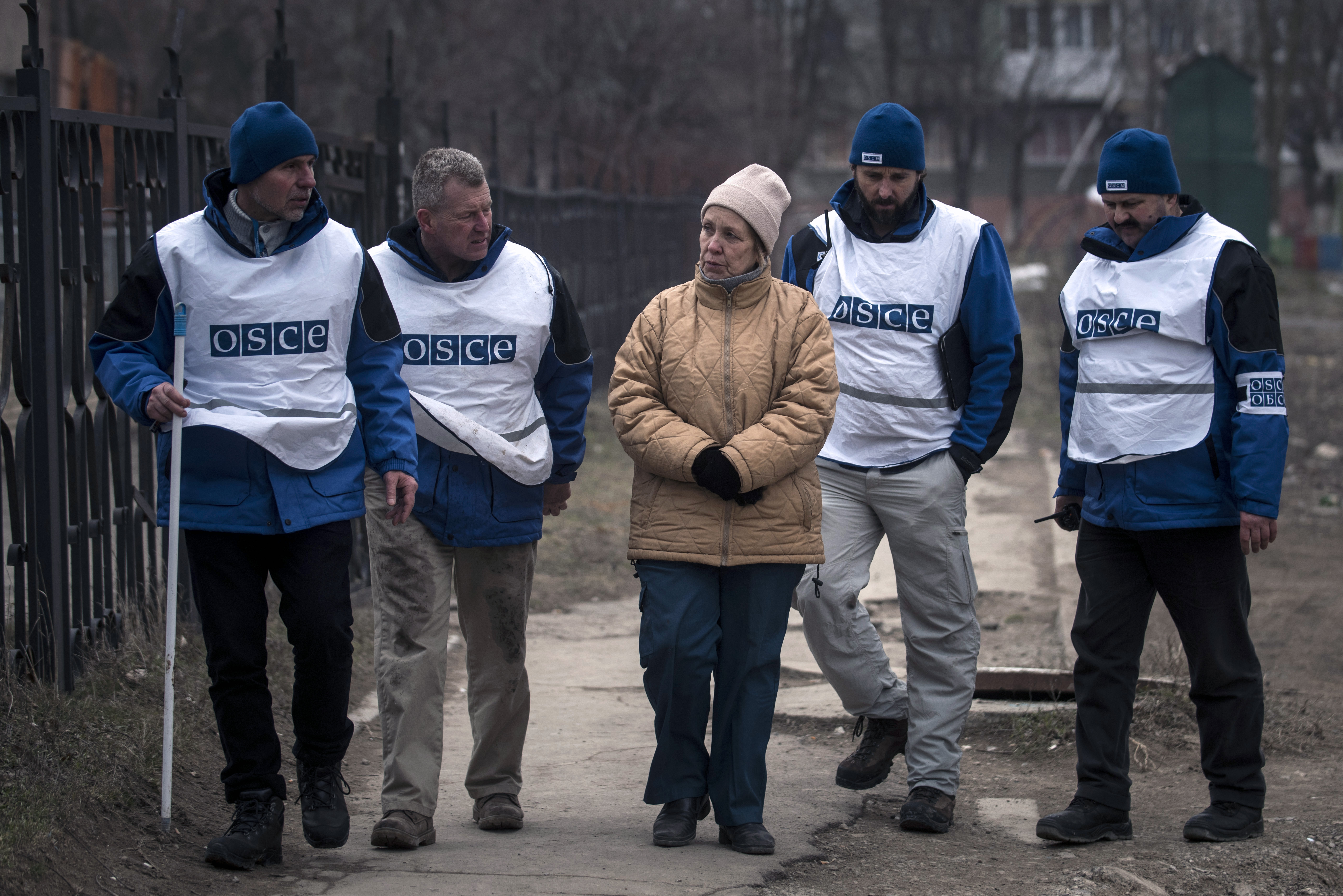 Monitors from the OSCE Special Monitoring Mission to Ukraine speak with a local resident, Mariupol, 27 January 2015.