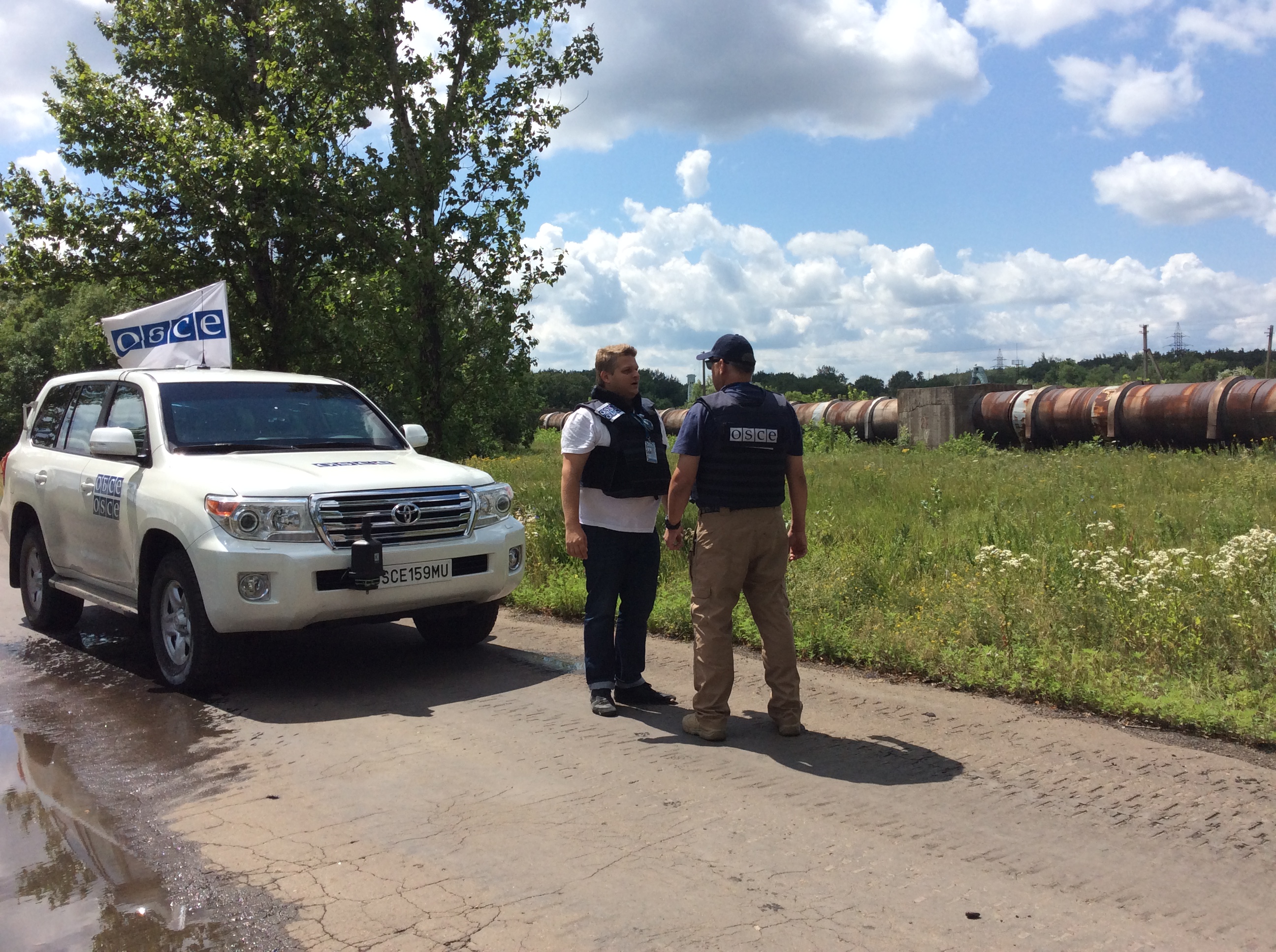 SMM monitors from the other side of the Line of Contact, in government-controlled Maiorsk, are present near the pipeline to observe the ceasefire, 16 July 2015.