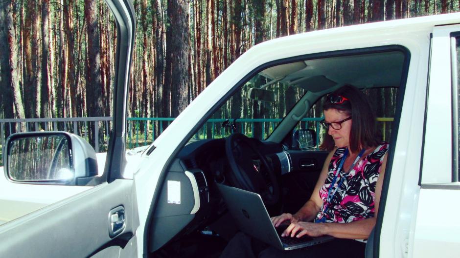 Sylvia L. Schaer Hahn, a Monitor from the OSCE Special Monitoring Mission to Ukraine, compiles a report after visiting an IDP camp near Kupjansk, 30 June 2014.