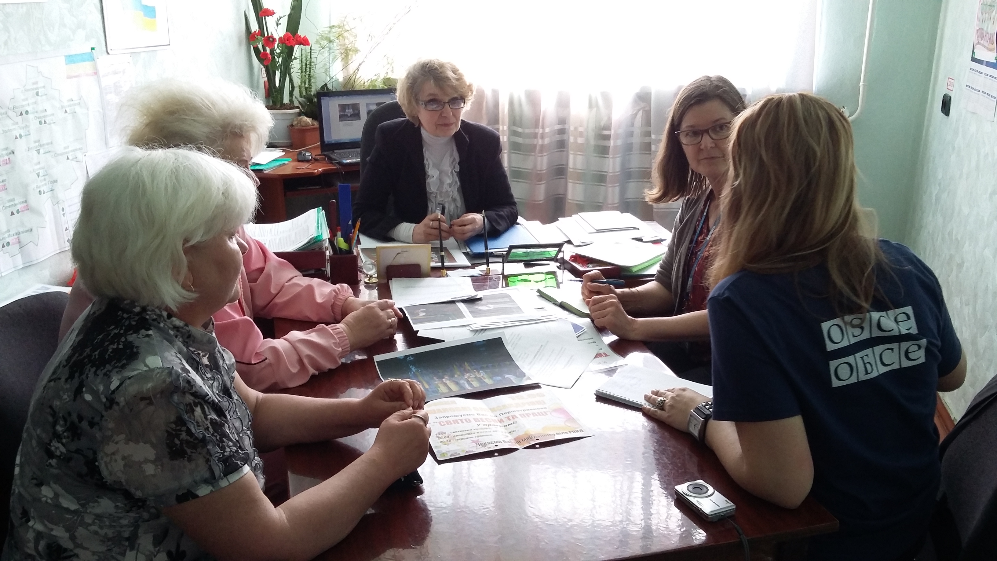 Sylvia L. Schaer Hahn, from the OSCE Special Monitoring Mission to Ukraine, meeting a women's association in Oleksandrivka, Donetsk region, 30 April 2015.
