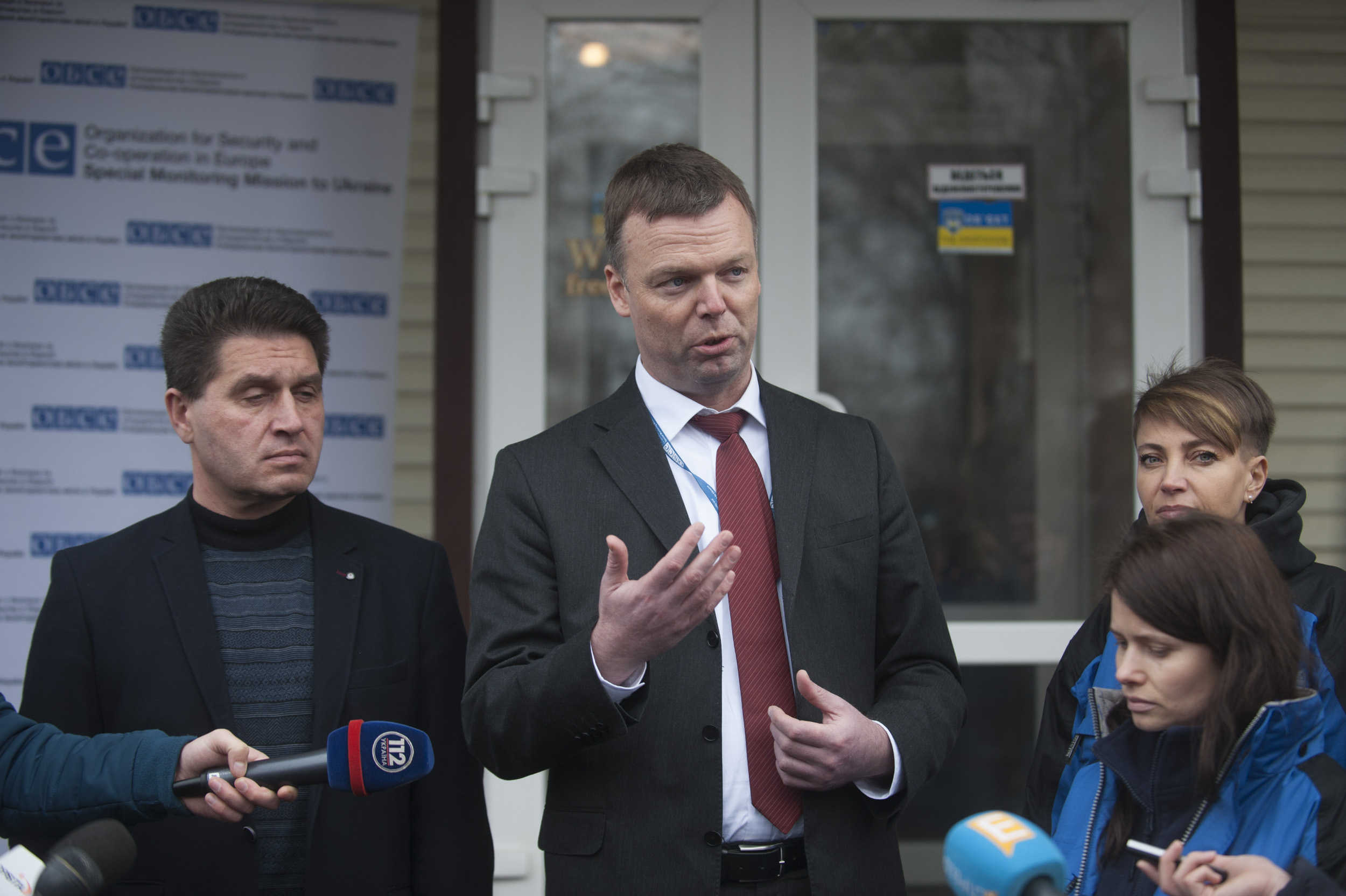 OSCE SMM Principal Deputy Chief Monitor Alexander Hug (c), SMM Donetsk Team Leader Olga Scripovscaia (r) and Krasnoarmiisk Deputy Mayor Yuriy Tretyak (l) at the opening of the SMM’s forward patrol base in Krasnoarmiisk, 14 January 2016.