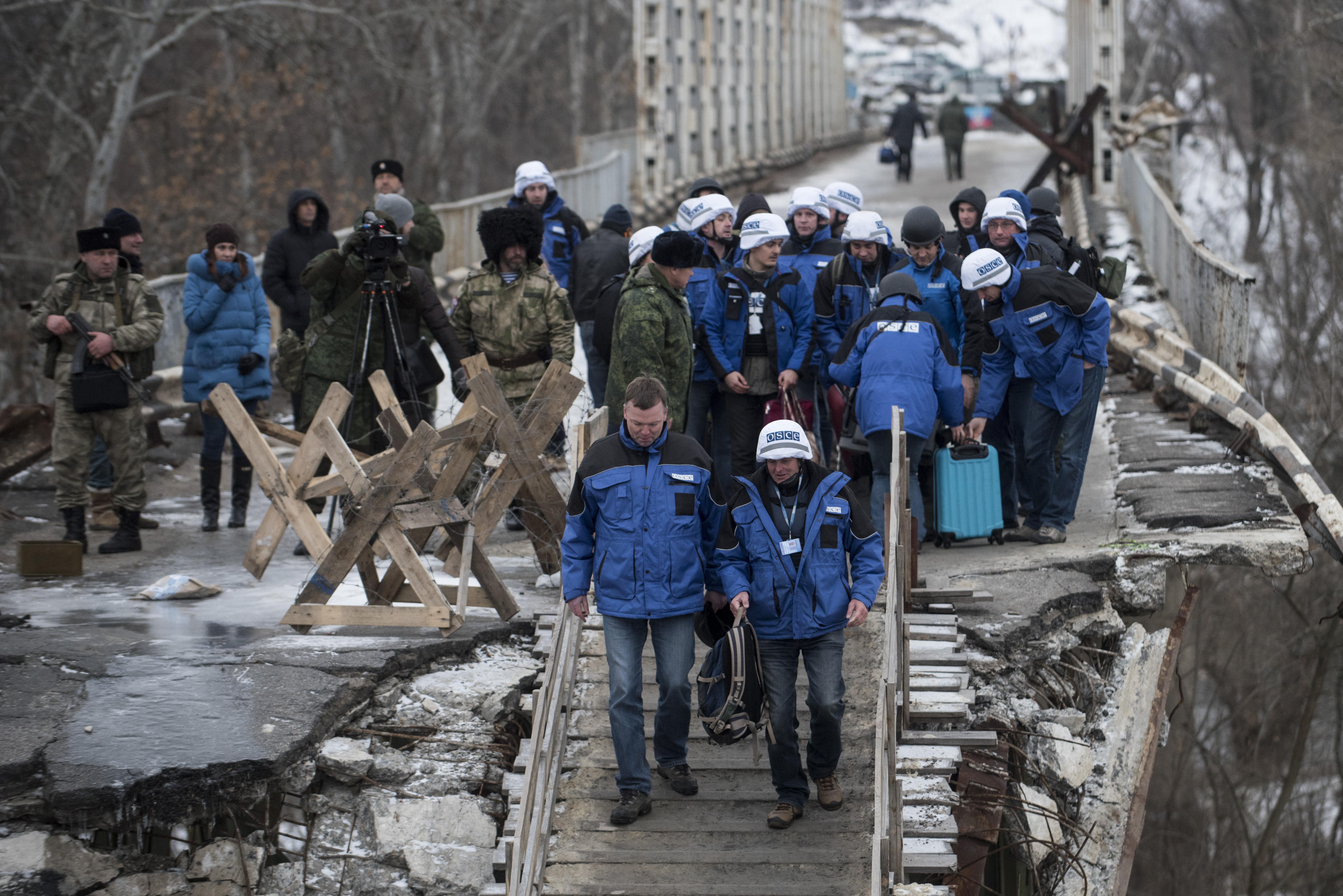 OSCE SMM monitors crossing a bridge in Stanystia Luhanska, 16 January 2016.