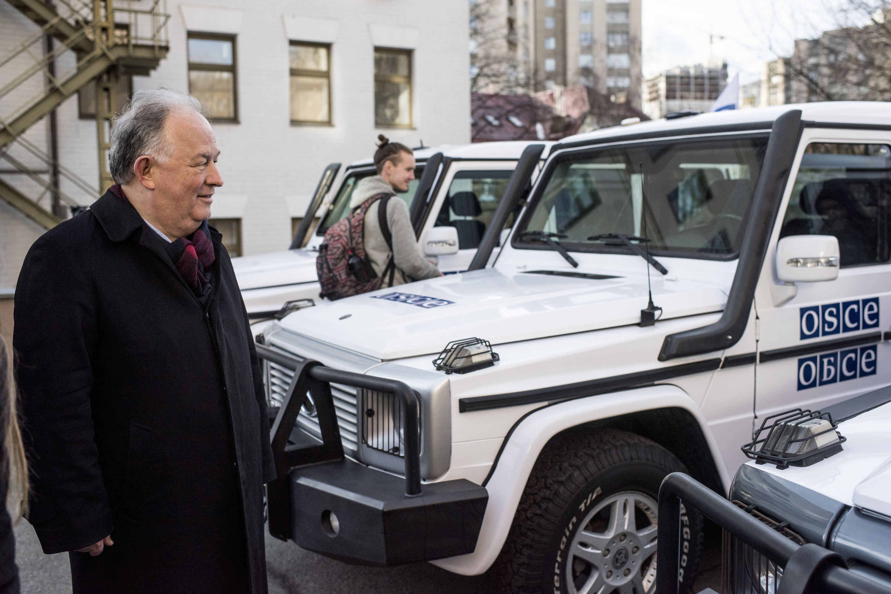 OSCE SMM Chief Monitor, Ambassador Etrugrul Apakan checking the donated Mercedes G-type vehicles that were previously used by the EU Police Mission in Afghanistan, 3 February 2016.