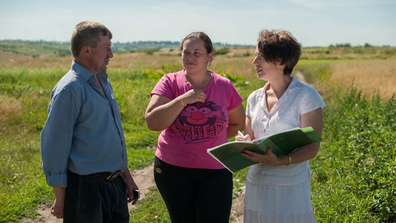Nataliya Mariychuk (r), Co-Founder of the Civic Movement of Donbas IDPs, discusses the logistics of a project with both her male and female colleague.