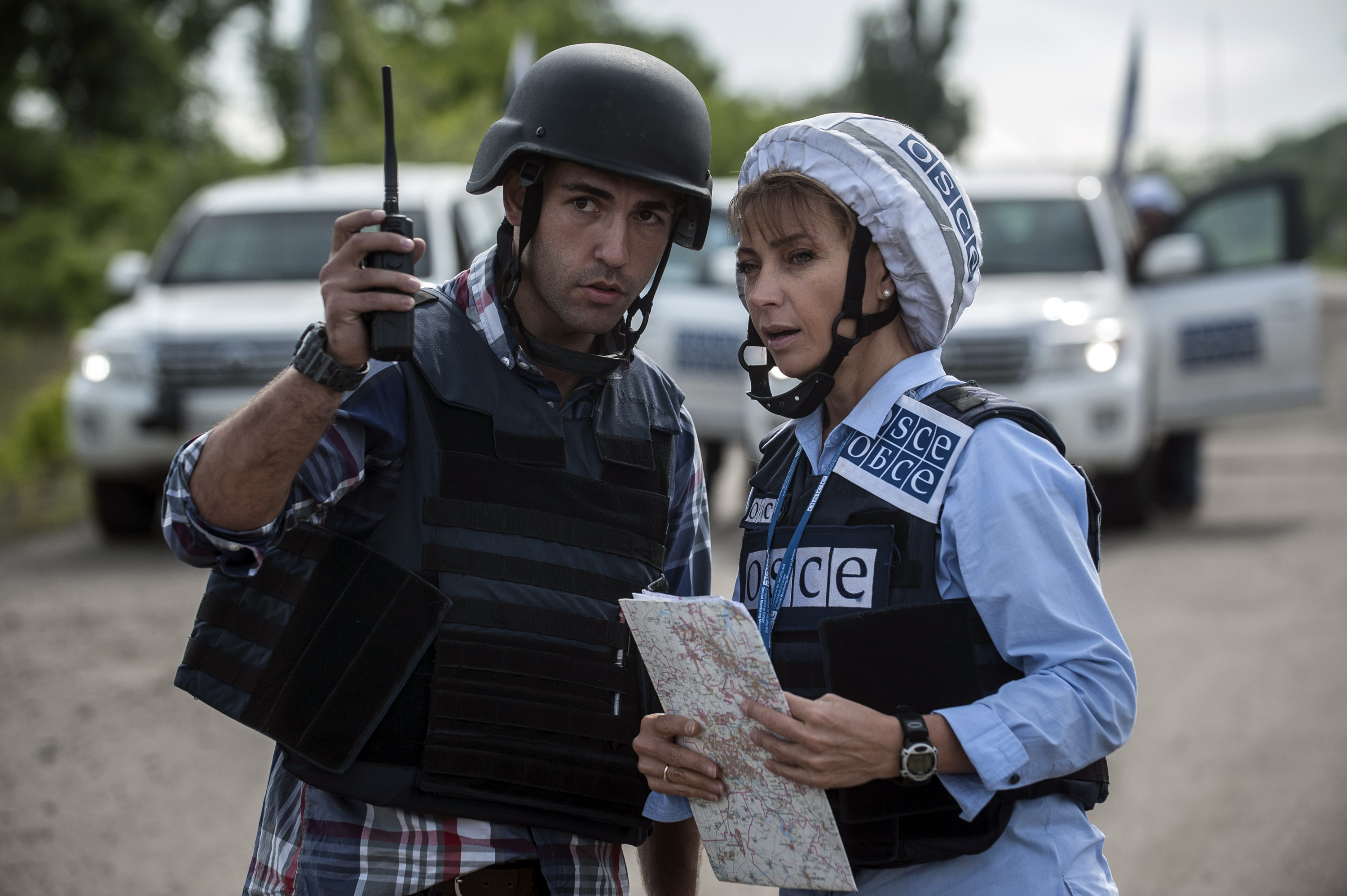 Two monitors patrolling in the Donetsk region to assess the general security situation.