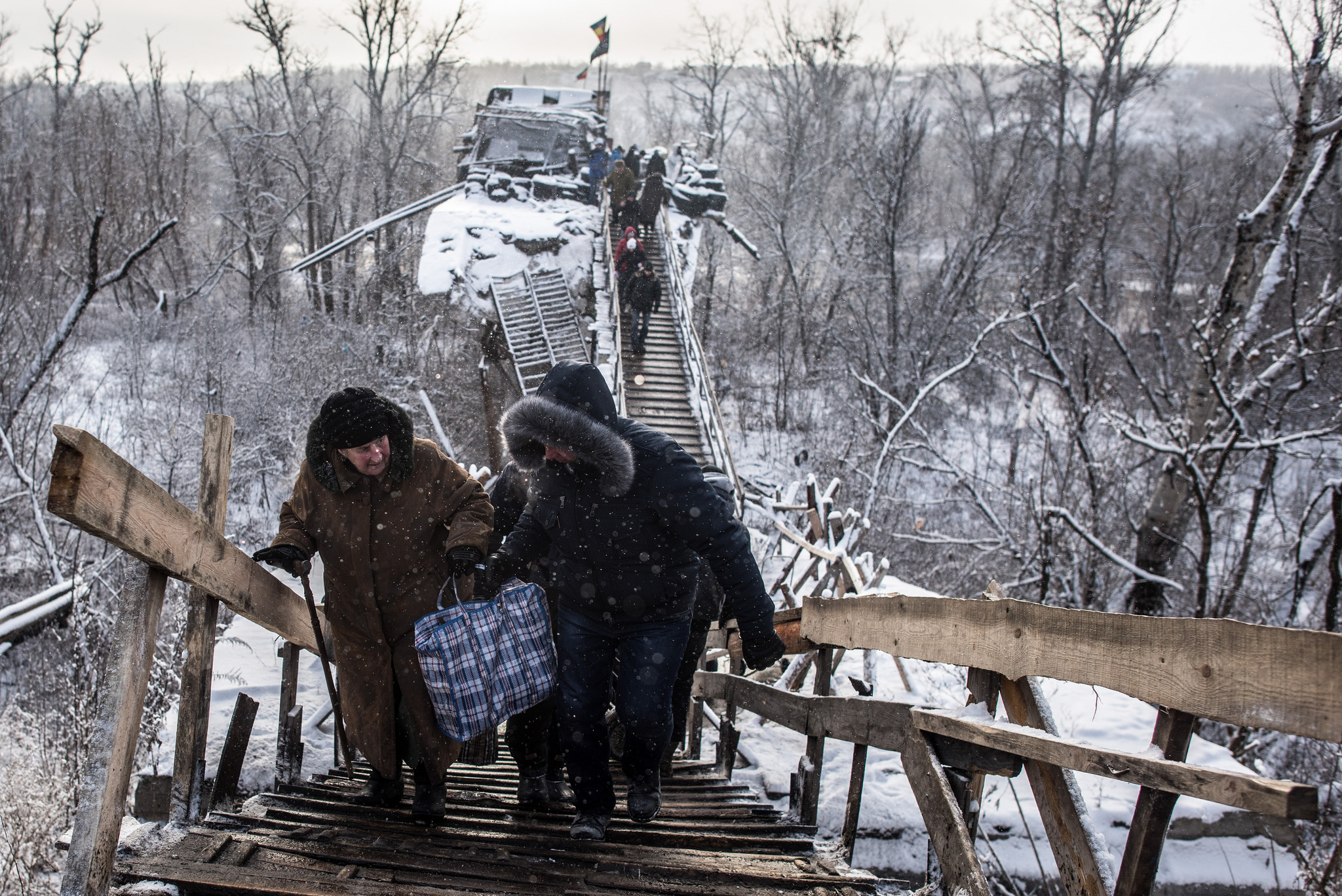 Civilians make the dangerous crossing over a damaged bridge in Stanytsia Luhanska, 16 December 2016.