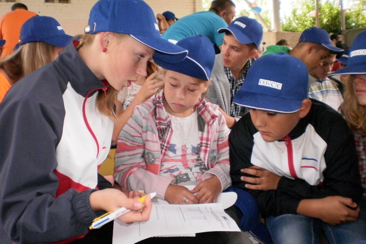 Ukrainian children solving a quiz on discovering an unexploded military ordonance during the Young Firefighters festival in Zaozerne, Crimea on 9 September 2013.