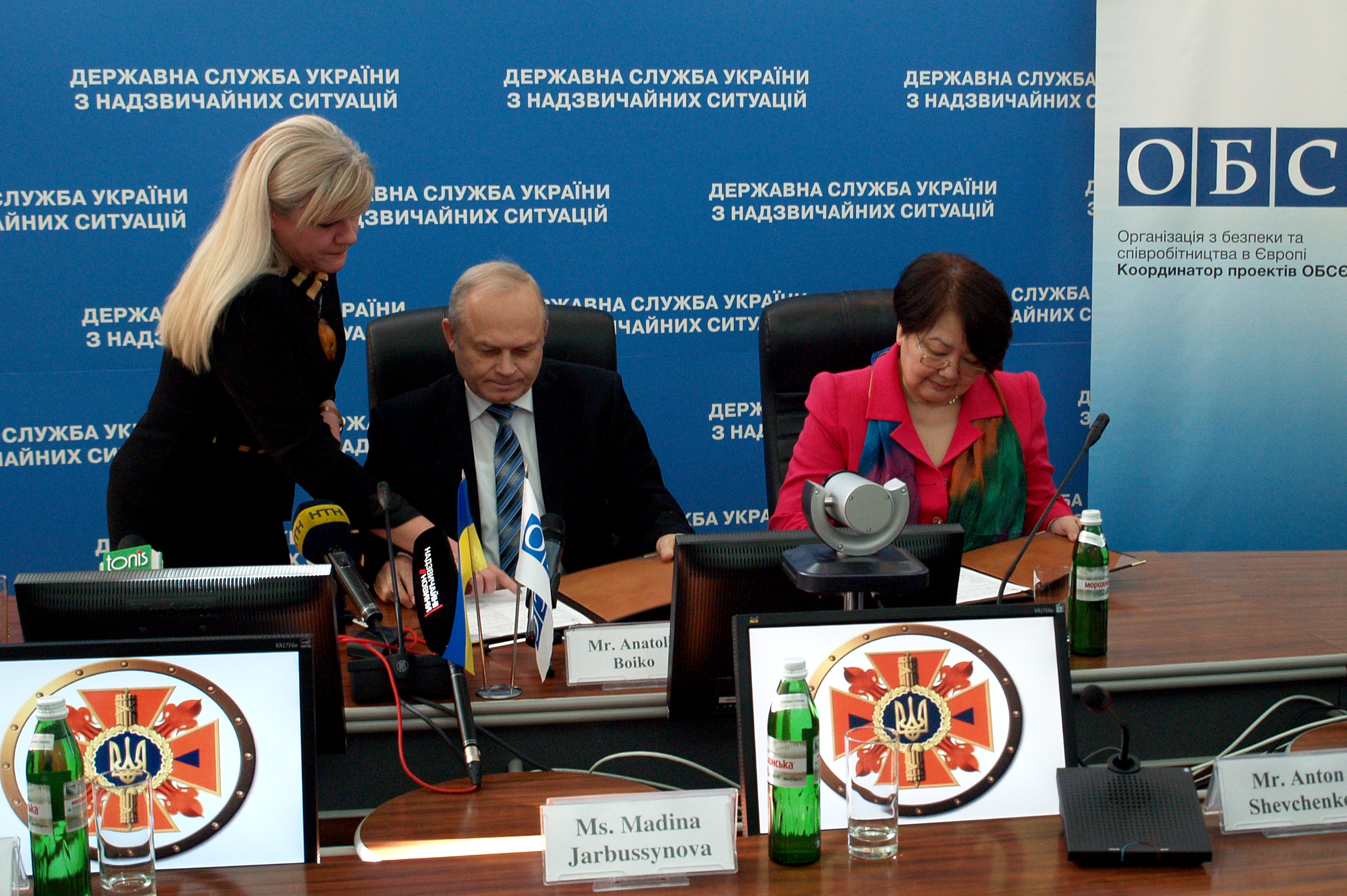 Anatoliy Boiko, First Deputy Head of State Emergency Service of Ukraine and Madina Jarbussynova, the OSCE Project Co-ordinator, sign handover agreement on donation of equipment for underwater demining on 21 March 2014.