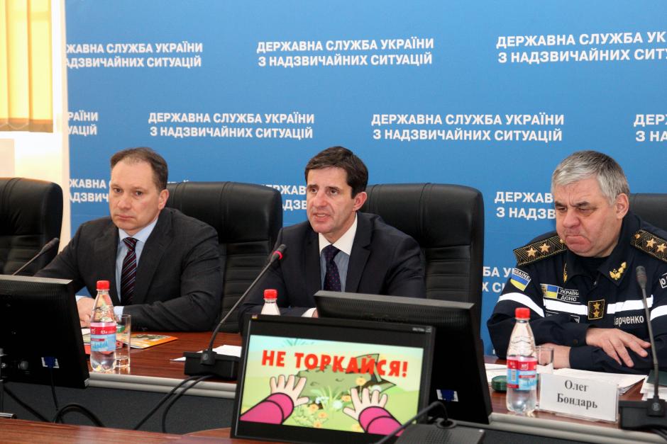 Vaidotas Verba, OSCE Project Co-ordinator in Ukraine (left) and Acting Head of country’s State Emergency Service Zorian Shkyriak calling on media to support efforts in informing civilians of threats related to explosive remnants of war, Kyiv, 3 April 2015.