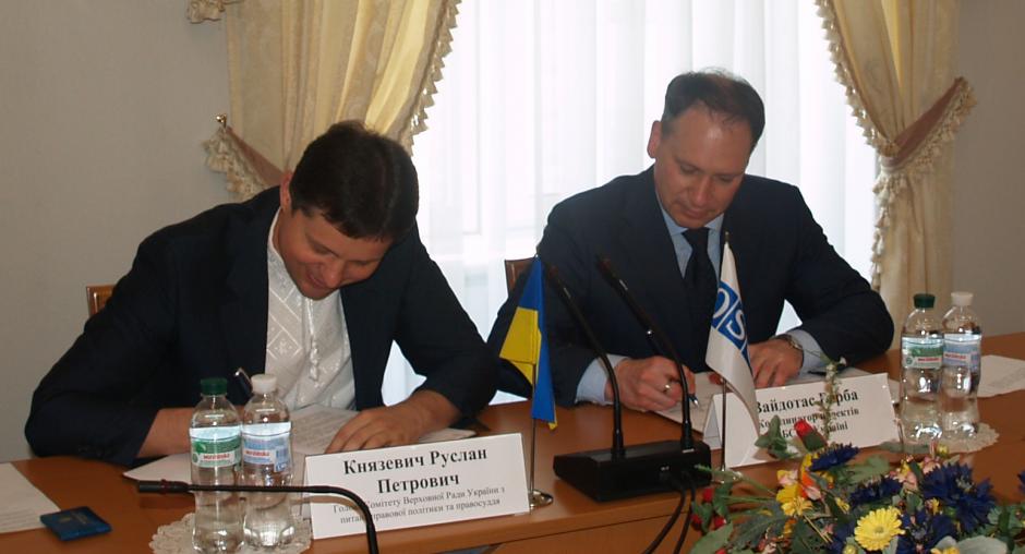 Kyiv, 21 May 2015 - OSCE Project Co-ordinator in Ukraine Vaidotas Verba and Ruslan Kniazevych on behalf of Verkhovna Rada’s Committee on Judicial Policy and Justice, signed a memorandum of co-operation on 21 May 2015. The document provides for the development and joint implementation of projects that would help parliamentarians draft and adopt laws, strengthening the rule of law in Ukraine.