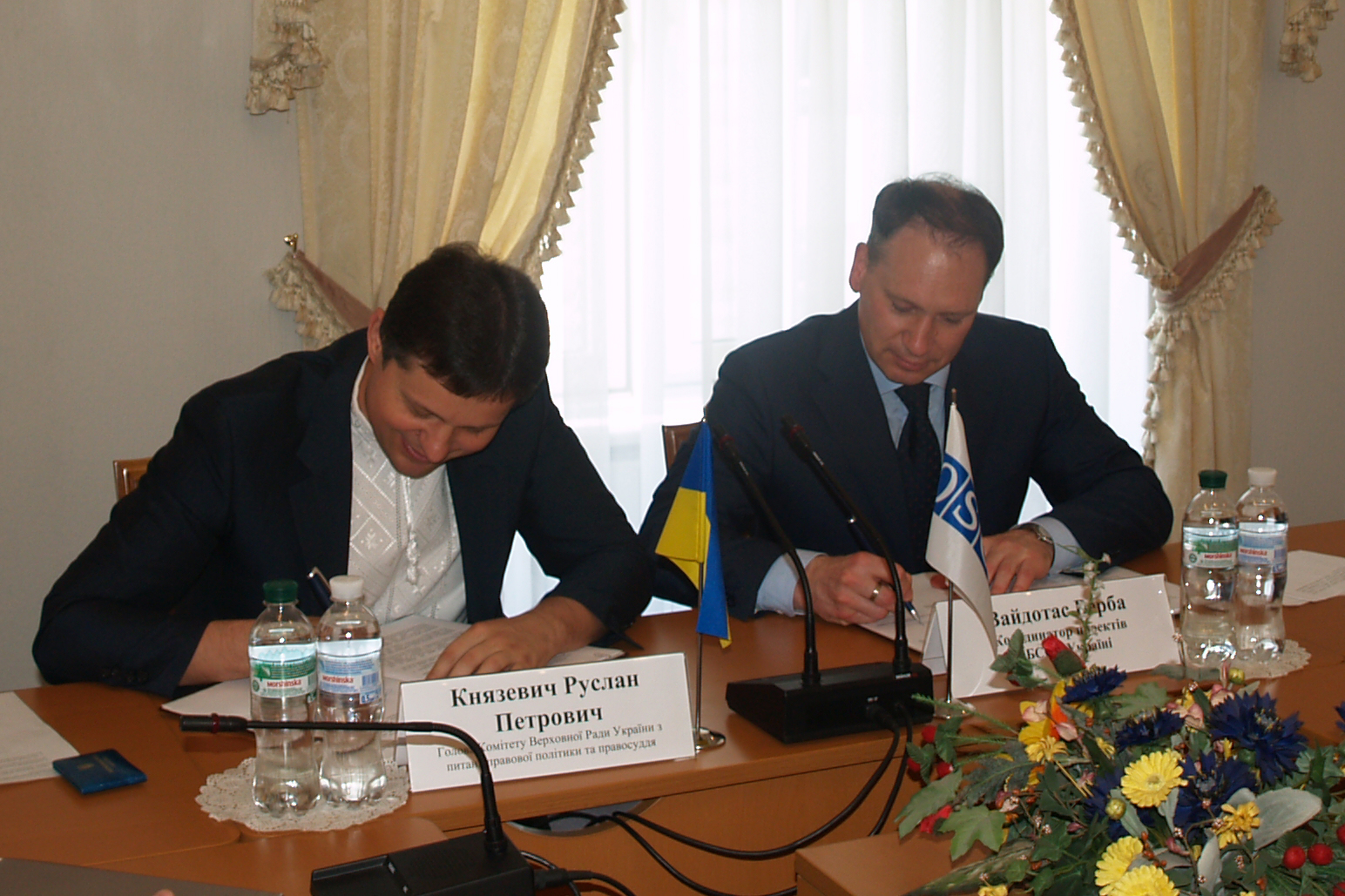 OSCE Project Co-ordinator in Ukraine Vaidotas Verba (r) and Ruslan Kniazevych, Head of Ukraine's Verkhovna Rada’s Committee on Judicial Policy and Justice sign memorandum of co-operation, Kyiv, 21 May 2015.