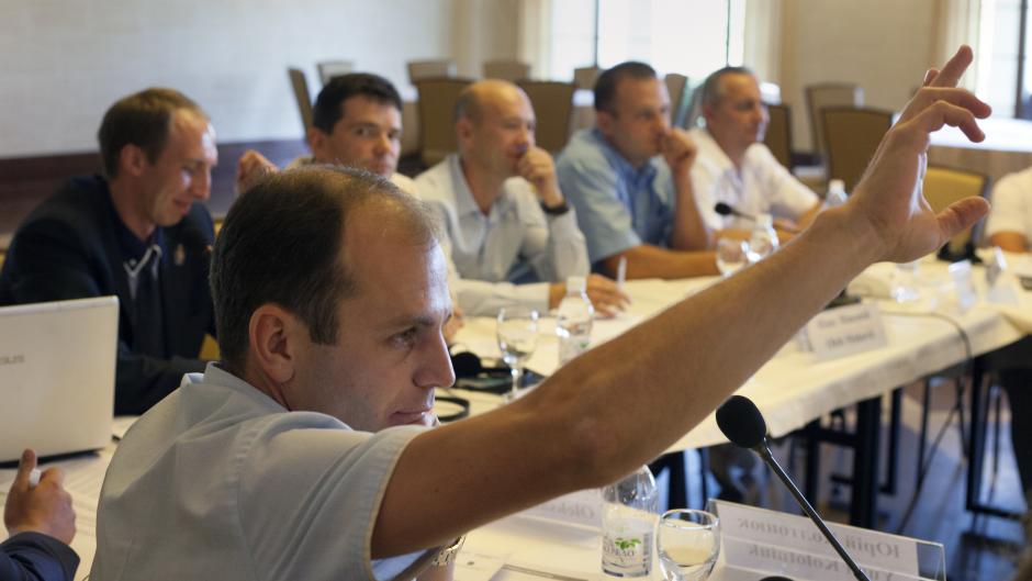 Participants during a Q&A session with international experts after demonstration of the video of a hearing at the European Court of Human Rights, Lviv, 26 August 2015.