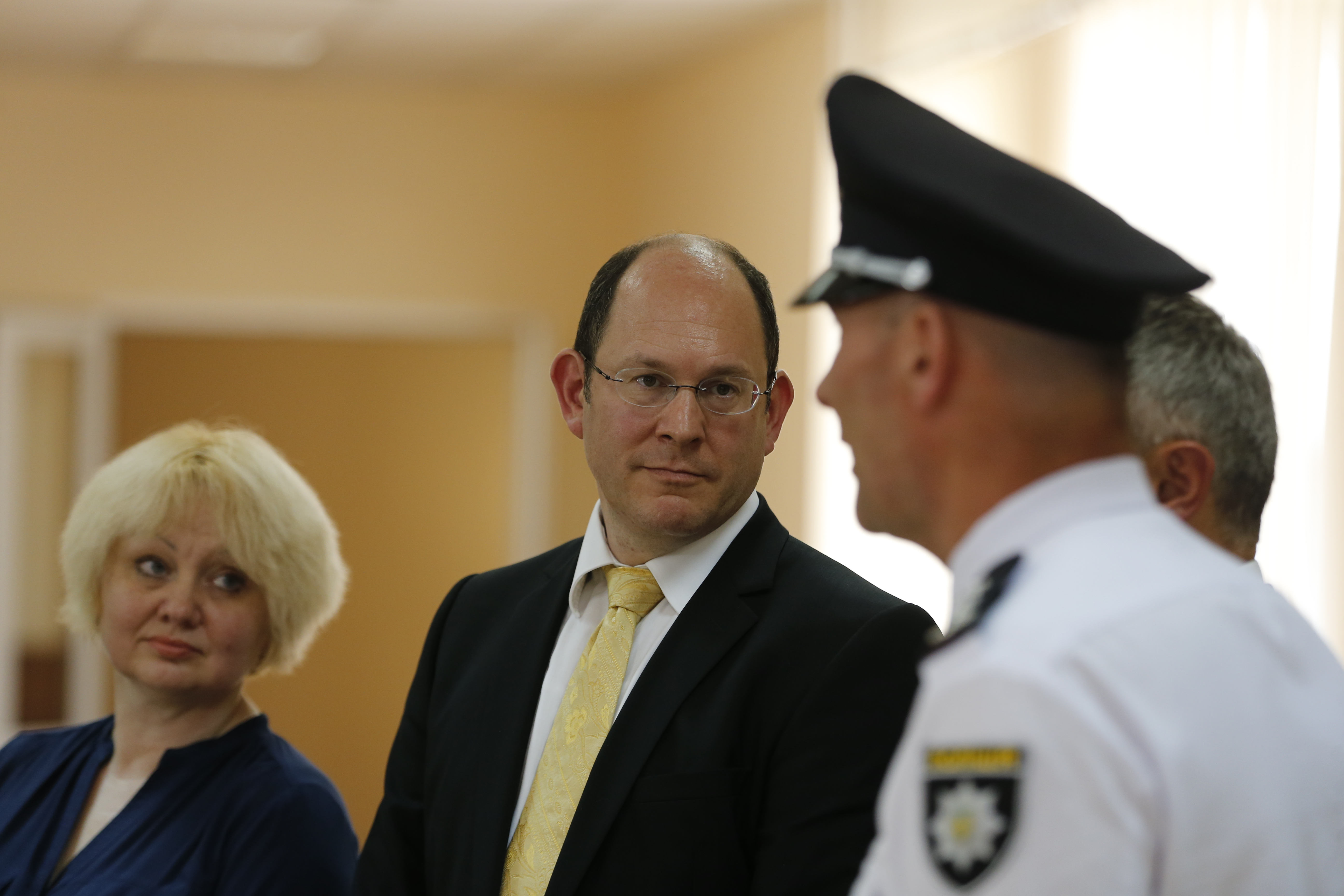 Rudenko and Erlich are guided through the halls of the Kharkiv National University of Internal Affairs by Valerii Vasylyovych Sokurenko, the rector of University.