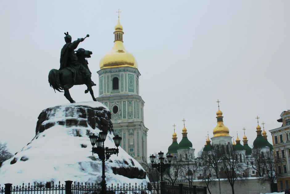 The Bogdan Khmelnytsky monument, with St Sophia Cathedral in the background, Kyiv.