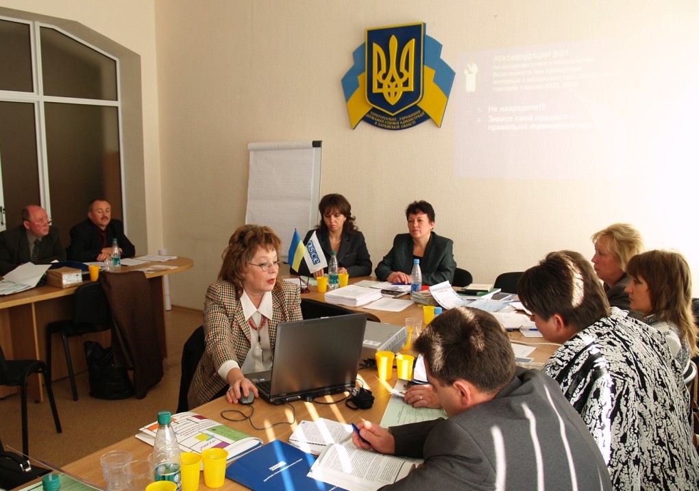 Yevgenia Koreneva (left) from the "Women's Community" NGO presents information on the trauma and needs of trafficking victims at a regional training for the judges, Kharkiv, 2 October 2007.